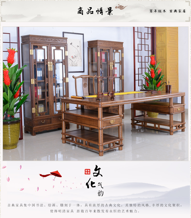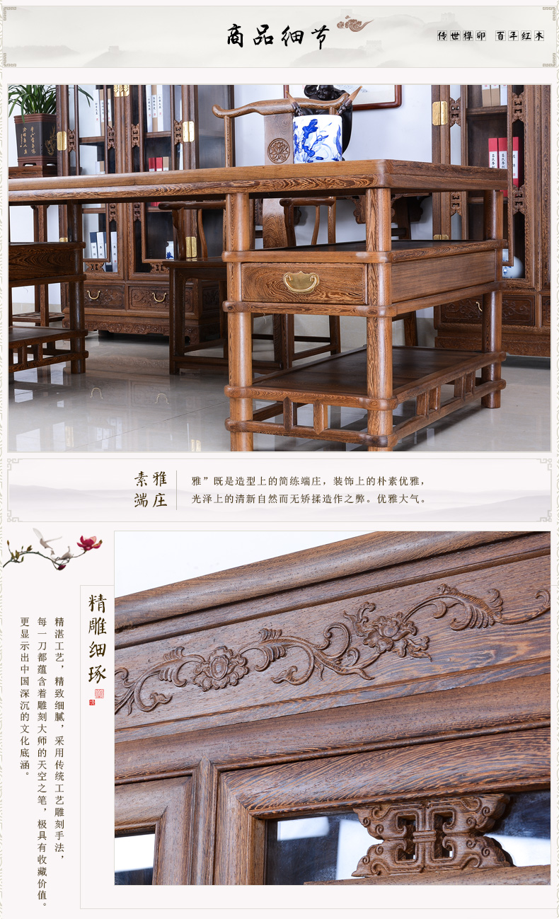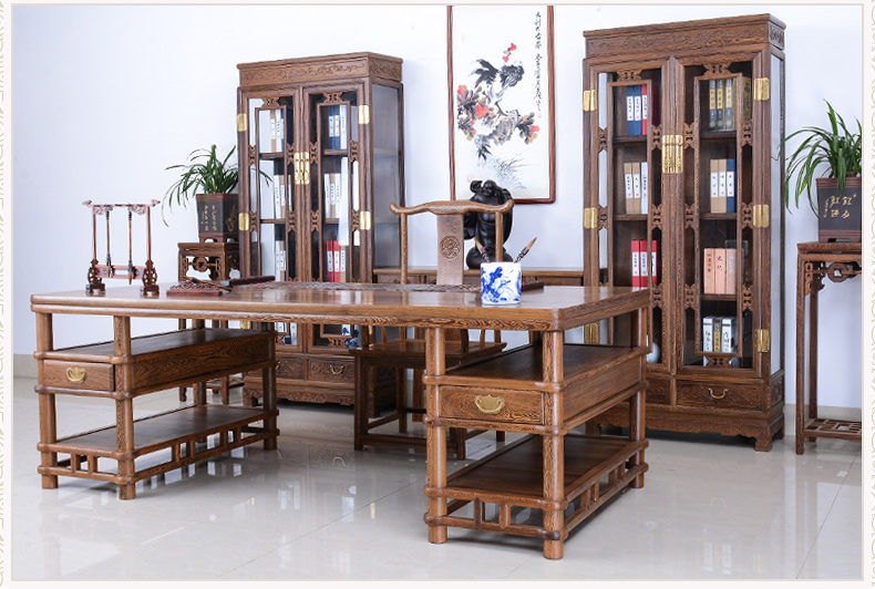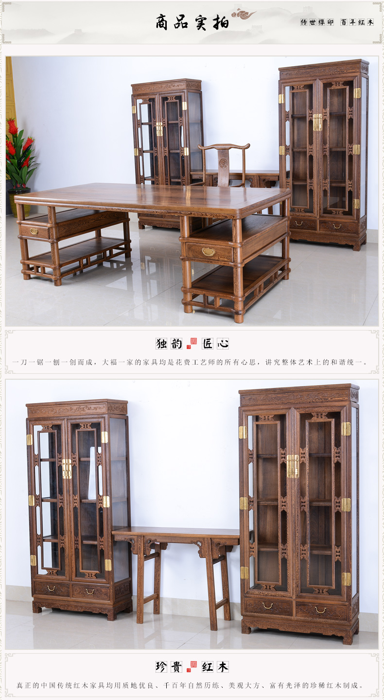 书房红木家具 双层鸡翅木画桌书柜条几花几七件套 图片是鸡翅木仅供参考 春本红木家具厂可来样来料定做不同尺寸书房红木家具,书房笔架,书架,花几等红木家具。